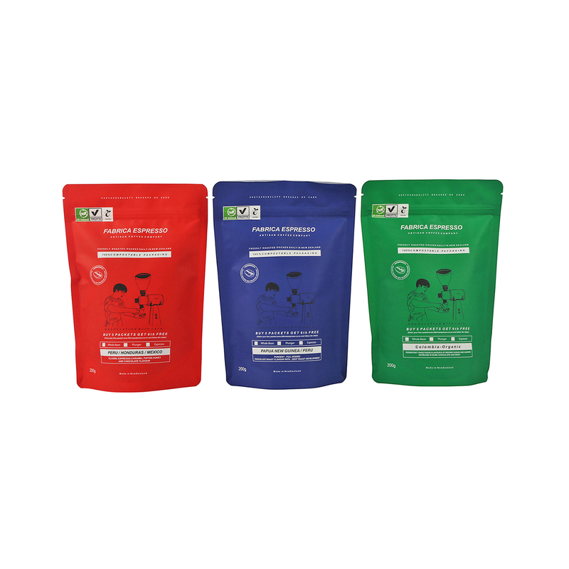 مصنوعة من البلاستيك من أكياس قابلة للوقوف القابلة للسماد للقهوة مصنوعة من صناعة 100 ٪ أو مواد معتمدة من السماد المنزلي والتي تنهار في وجود الأكسجين وأشعة الشمس والماء. جميع المكونات بما في ذلك السوستة والصمامات هي أيضا قابلة للسماد كامل.